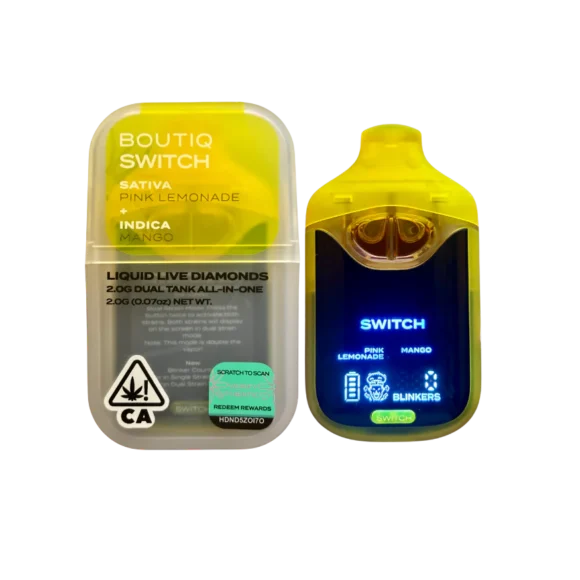 Boutiq Switch Liquid Live Diamonds (Sativa Pink Lemonade + Indica Mango) provides the perfect balance of potency, flavor, and versatility. Choose your ideal experience and enjoy a premium concentrate with every use.
